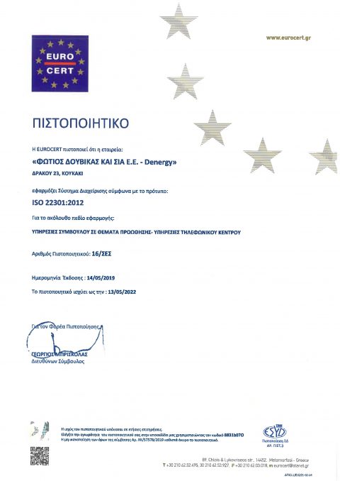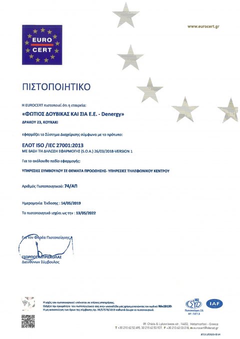 Η DELTAENERGY είναι πιστοποιημένη με τα διεθνώς αναγνωρισμένα πιστοποιητικά ως προς τη διαχείριση ποιότητας, την περιβαλλοντική διαχείριση, την επιχειρησιακή συνέχεια, την ασφάλεια πληροφοριών, τη διαχείριση ενέργειας, και την υγεία και ασφάλεια.